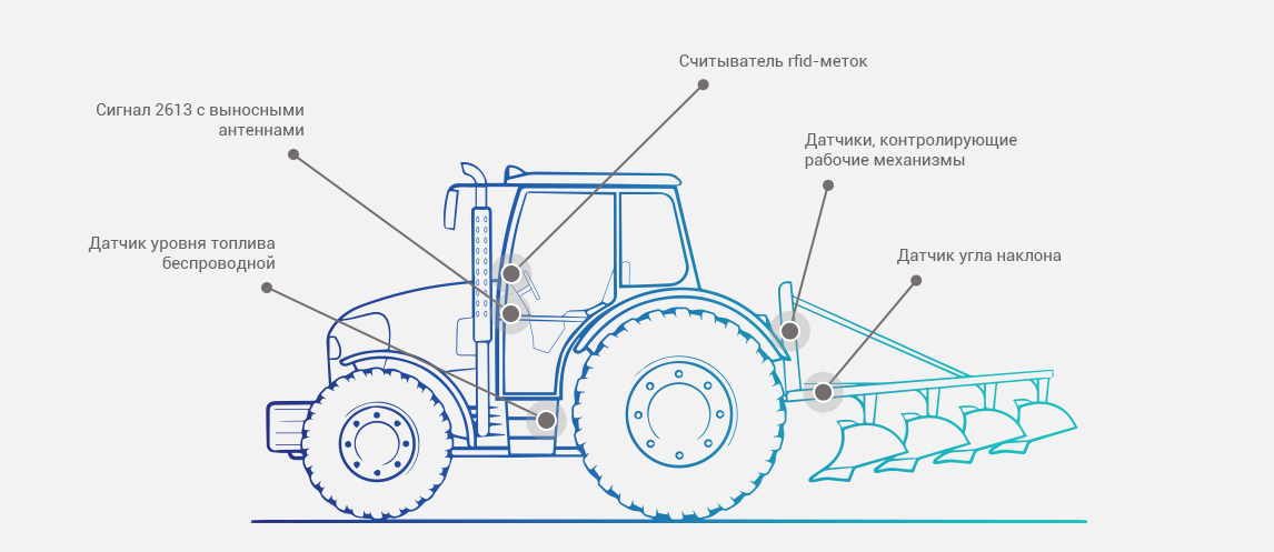 Параметры работы двигателя и других систем трактора (обороты, температура охлаждающей жидкости, нажатие педали акселерометра и др.).